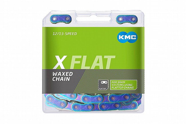 KMC XFLAT Waxed chains are specifically designed for modern SRAM 12/13-speed drivetrains and are characterized by their distinctive flat top profile. This design allows for a narrower chain while still providing high strength and durability.