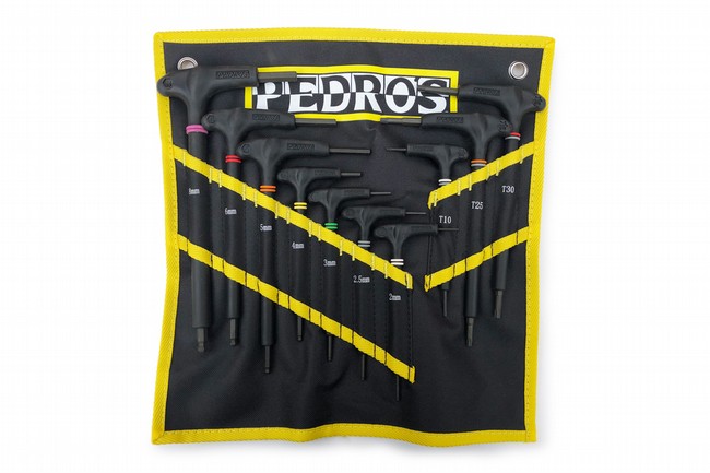 Pedro's Pro T/L wrenches have become a favorite of mechanics around the world. The updated set, housed in a custom storage pouch, includes hex and torx sizes used day in and day out; 2, 2.5, 3, 4, 5, 6, and 8mm hex wrenches, and T10, T25, and T30 torx wrenches.