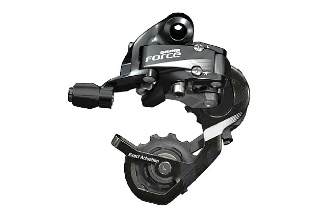 The SRAM Force 22 Rear Derailleur is compatible with SRAM Force 22 and Red 22 drivetrain components. Choose from short cage (178g; 28 tooth max sprocket) or medium cage (WiFLi) (187g; 32 tooth max sprocket).